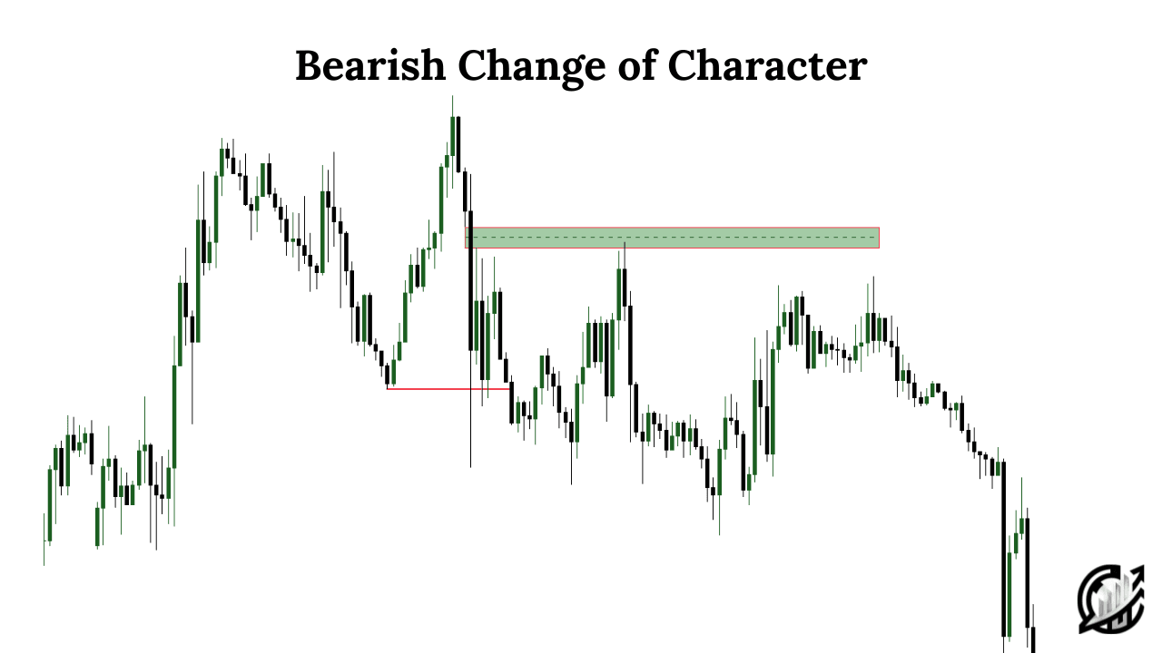 Change of character in bullish market is referred to as bearish change of character. In uptrend, market creates higher highs and higher lows. A change of character from bullish to bearish is a critical moment. It is because market signals a potential reversal. It occurs in the following way: