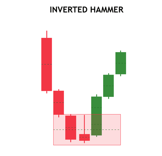 - Inverted hammer closes near or slightly above the opening price, leaving a small body and a longer upper wick. The small body indicates that the opening and closing prices were close to each other.